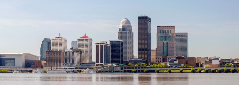 A landscape photo of the city skyline of Louisville, Kentucky, alongside the Ohio River.