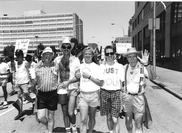 See pictured: Jack Kersey on the far left and Charles Gruenberger on the far right walking with their friends in the local pride parade.