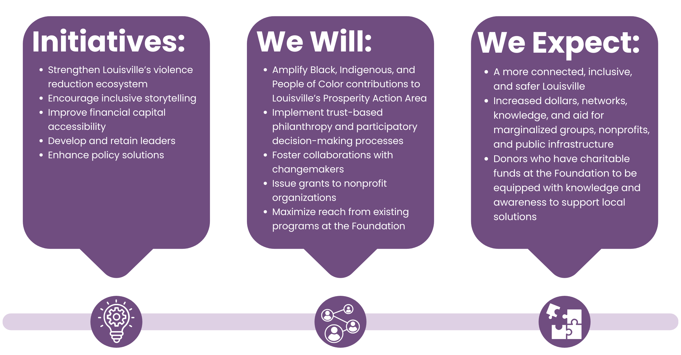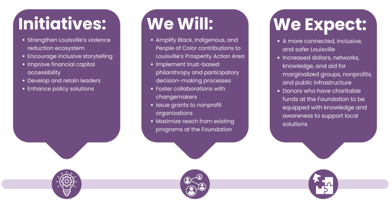 Graphic with text that reads: Initiatives: Strengthen Louisville’s violence reduction ecosystem Encourage inclusive storytelling Improve financial capital accessibility Develop and retain leaders Enhance policy solutions; We Will: Amplify Black, Indigenous, and People of Color contributions to Louisville’s Prosperity Action Area Implement trust-based philanthropy and participatory decision-making processes Foster collaborations with changemakers Issue grants to nonprofit organizations Maximize reach from existing programs at the Foundation; We Expect: A more connected, inclusive, and safer Louisville Increased dollars, networks, knowledge, and aid for marginalized groups, nonprofits, and public infrastructure Donors who have charitable funds at the Foundation to be equipped with knowledge and awareness to support local solutions
