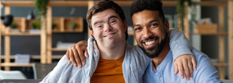 man with down syndrome smiling and hugging another smiling man