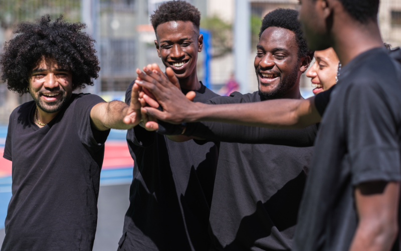 Pictured: A photo of five Black youth bonding through their community of support.