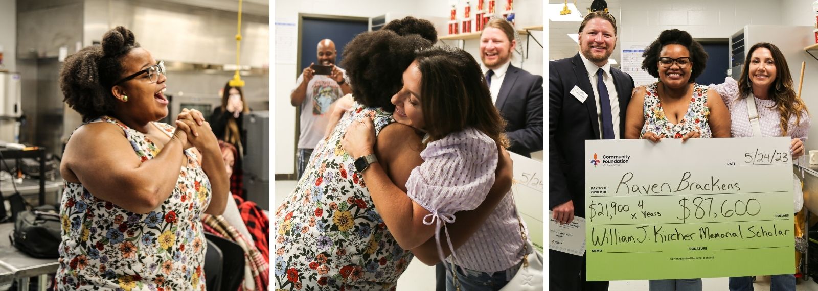 Photos depicting a young woman with glasses being surprised by a donor with a scholarship during class