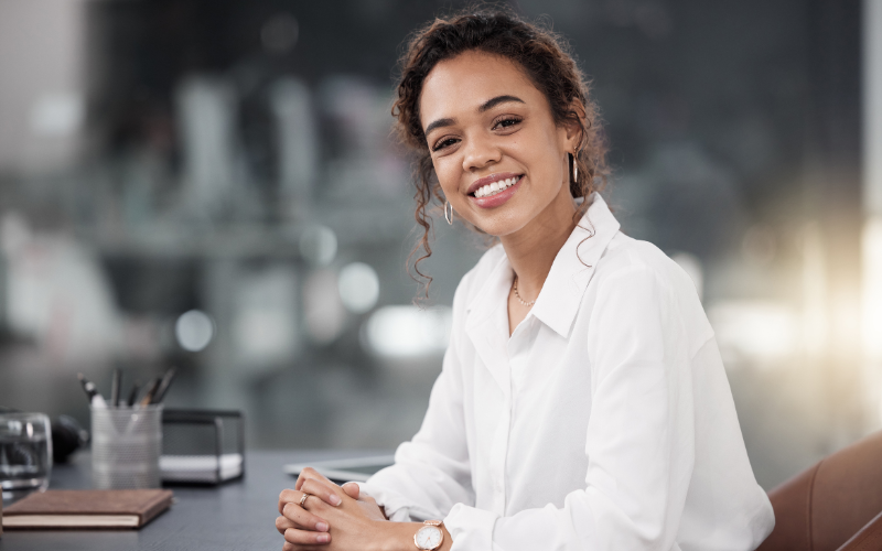 There is a black woman sitting at a desk and smiling.