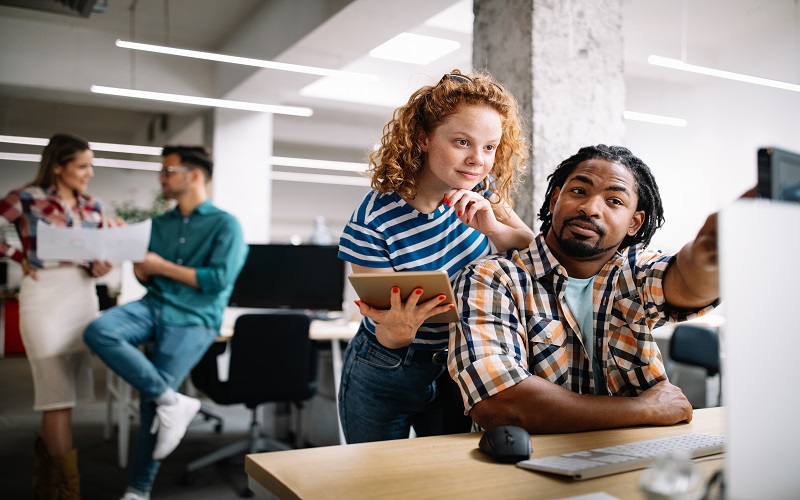 We're hiring for a Creative Services Manager! Here is pictured a creative services manager working collaboratively with his coworker at his computer.