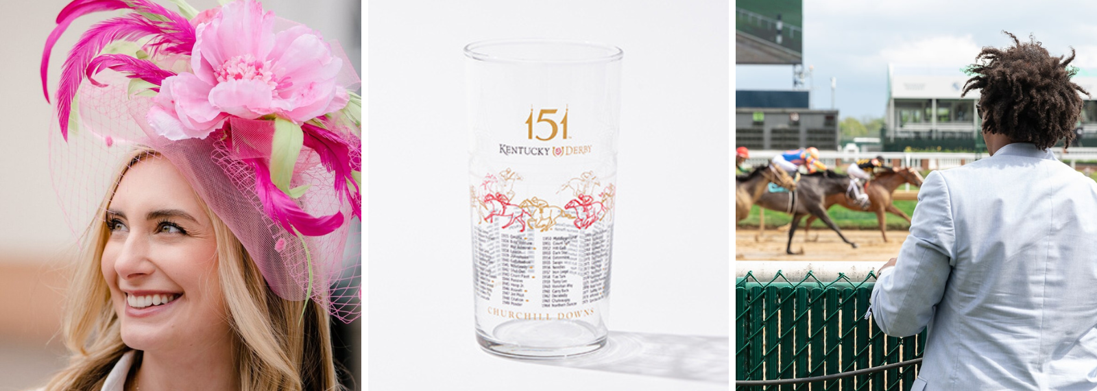 graphic featuring three pictures of a young woman wearing a fascinator, the 151 Kentucky Derby glass, and a young man looking out at the race track