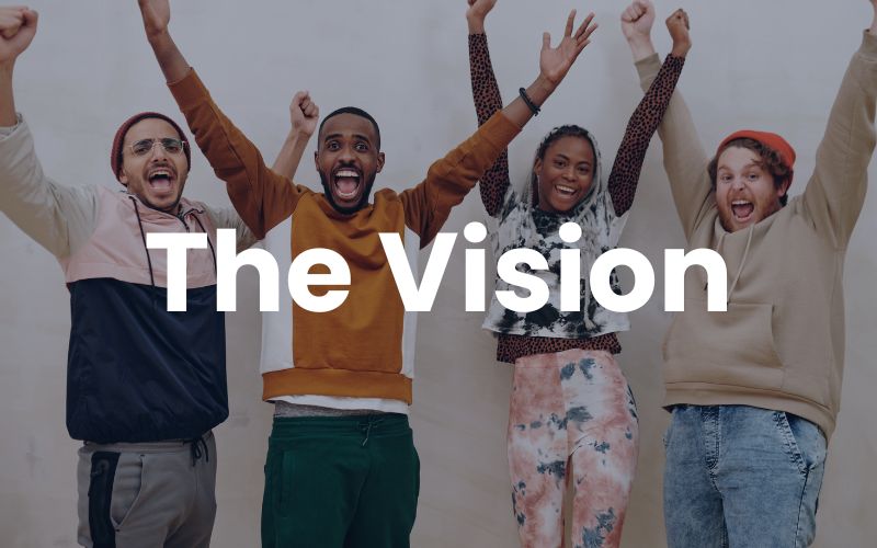 graphic with image depicting a group of young, diverse people, happy and smiling, and text that reads the vision