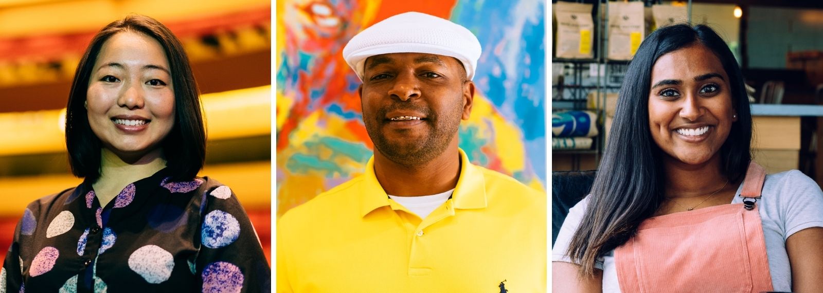 two young women smiling and one middle-aged man smiling