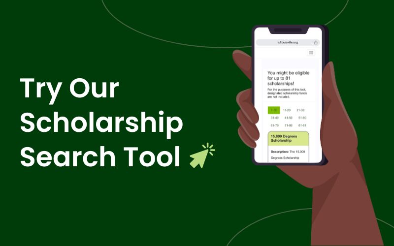 graphic that reads "try our scholarship search tool" with a hand holding a phone