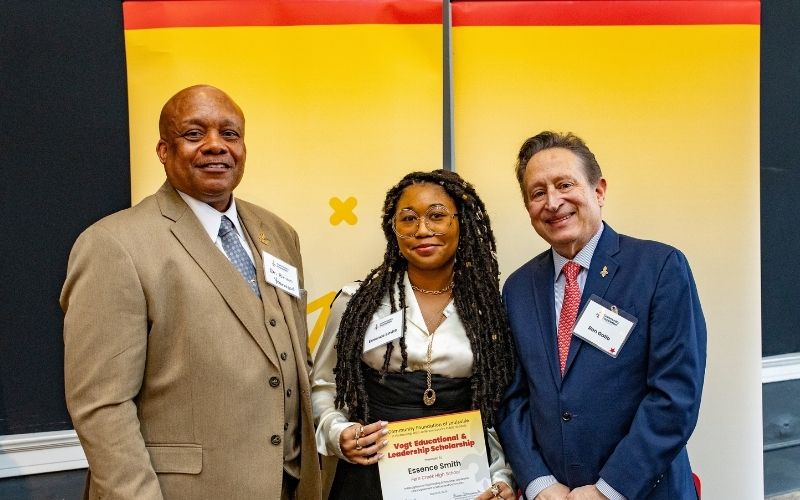 Photo featuring JCPS Superintendent Brian Yearwood, Ph.D., Vogt Scholar, Essence Smith, and Community Foundation CEO & President, Ron Gallo
