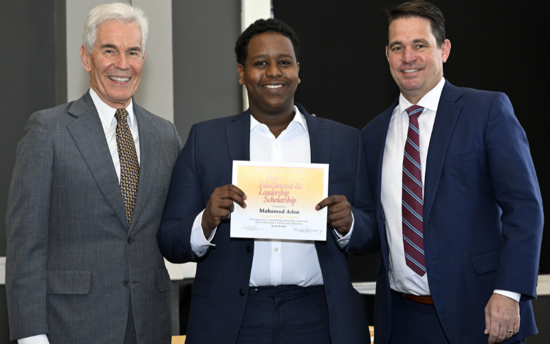 Vogt Scholarship recipient smiling with JCPS Superintendent Marty Polio and Donor Henry Heuser